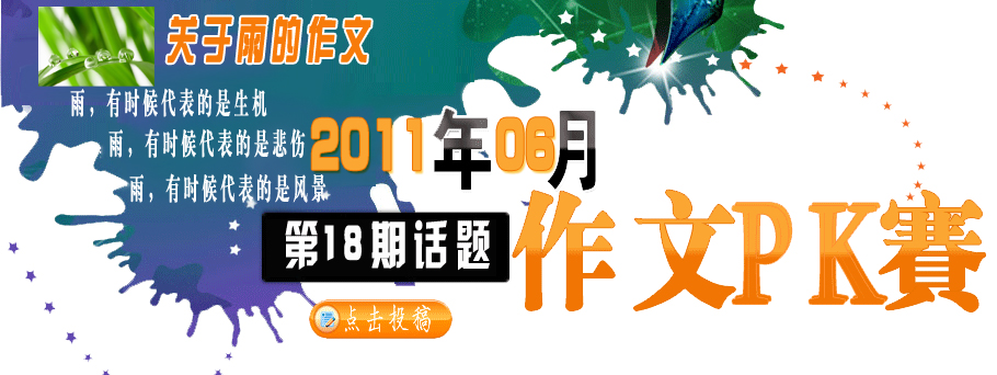 1、登錄E度作文網(wǎng)投稿箱(http://www.szhslsb.cn/include/zw_tougao.html),直接投稿。 2、投稿標題前注明[PK賽]關于雨的作文:XXXXXXX字樣,如未注明將視為普通稿件處理,不參與最終評獎。 3、參賽作品須在題目下注明作者姓名、年級、聯(lián)系電話、詳細聯(lián)系地址,否則影響獎品的發(fā)放,本站概不負責。 PK賽細則: